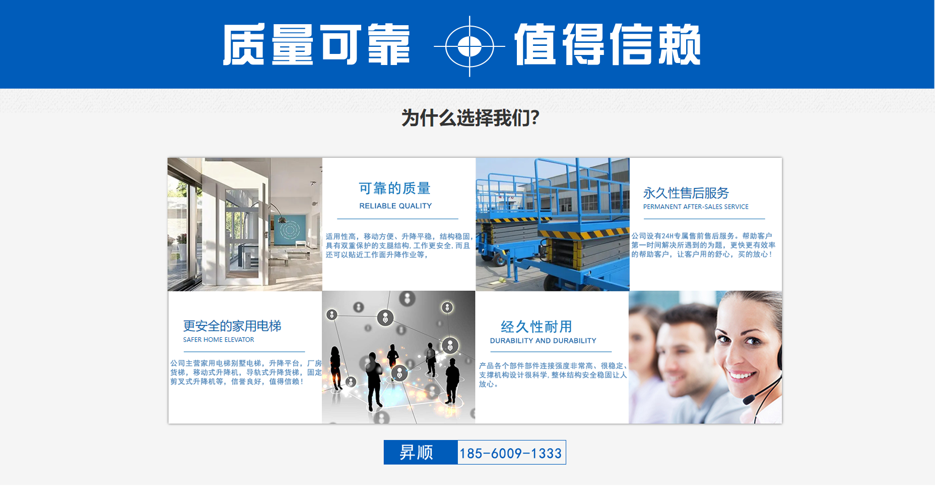山東昇順液壓升降機(jī)械有限公司是一家主營(yíng)家用電梯,別墅電梯,升降平臺(tái),廠(chǎng)房貨梯,移動(dòng)式升降機(jī),導(dǎo)軌式升降貨梯,固定剪叉式升降機(jī)等產(chǎn)品企業(yè),質(zhì)量可靠,值得信賴(lài)。 用戶(hù)至上,以用戶(hù)為中心”是公司永遠(yuǎn)堅(jiān)持的服務(wù)宗旨,贏(yíng)得用戶(hù)的贊許是我們的榮譽(yù),及時(shí)滿(mǎn)足用戶(hù)的需求,是我們公司的愿望。長(zhǎng)期以來(lái),公司員工以?xún)?yōu)質(zhì)的服務(wù),取悅于用戶(hù),以誠(chéng)信的言行取信于用戶(hù),得到了用戶(hù)們的好評(píng)。我們期待著與您更加愉快的合作!公司的發(fā)展,離不開(kāi)社會(huì)的大力支持,在社會(huì)的支持和幫助下,我們正昂首闊步邁向未來(lái)! 我們的經(jīng)營(yíng)方針是:以質(zhì)量求生存,以產(chǎn)品求發(fā)展,以信譽(yù)保合作,以服務(wù)贏(yíng)客戶(hù)?! ”竟緦?duì)產(chǎn)品質(zhì)量和各項(xiàng)服務(wù)恪守合同承諾,并愿與新老客戶(hù)精誠(chéng)合作,共創(chuàng)未來(lái)?! 」揪瘢簞?chuàng)新是主題,超越是不懈的追求。 公司宗旨:信譽(yù)保證,誠(chéng)信為本。 我們會(huì)以合理的價(jià)格,良好的信譽(yù),雄厚的實(shí)力,優(yōu)質(zhì)的產(chǎn)品,最周到的服務(wù),服務(wù)于廣大新老客戶(hù)!...